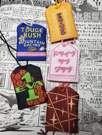 The Touge Rush Omamori has the mountains with sakura on the front and on the back has the main Touge Rush Mountain Style Racing logo on the back!